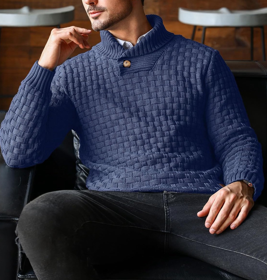 Being prepared or hitting the trail should not require that we sacrifice fashion and comfort. While this design is unique with the high knit collar and large button enclosure, it is functional, warm, and emphasizes that hard-earned build.